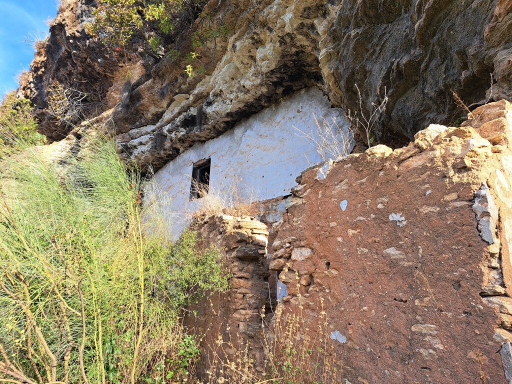 El sendero que articula este conjunto de viviendas trogloditas se caracteriza por su angostura y proyección al abismo de la garganta. Esta disposición, de naturaleza tanto pragmática como pintoresca, obedece a una estrategia de optimización de recursos: el bajo coste constructivo se deriva de aprovechar la cavidad natural, que está donde está, limitando la intervención técnica al cerramiento perimetral y a la adecuación volumétrica interna. Asimismo, este emplazamiento en altura constituye una medida preventiva frente a las avenidas del arroyo, garantizando simultáneamente la proximidad a las huertas ubicadas en las vegas y bancales, y a las zonas de pastoreo. Se trata, en esencia, de una solución regida por criterios de economía de subsistencia.