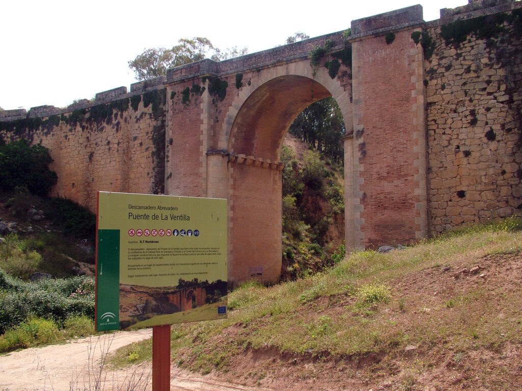 Entre los hitos arquitectónicos que jalonan este paraje, destaca el puente de la Ventilla, integrado en el trazado de la antigua carretera Ronda-Campillos. Construido en el primer tercio del siglo XX, esta obra de ingeniería, de bella factura, presenta un único arco de medio punto que se eleva hasta los 25 metros sobre el cauce. Actualmente, la propia estructura del viaducto se ha convertido en un recurso recreativo. Su bóveda alberga un rocódromo y es escenario habitual de actividades de turismo activo, tales como el puentismo o el rápel en volado. La llanura existente a sus pies es el antiguo abrevadero-descansadero donde confluyen las vías pecuarias Cañada Real de Granada y Córdoba y Cordel del Camino de los Pescadores. Ocupa una superficie de 0,7 ha.