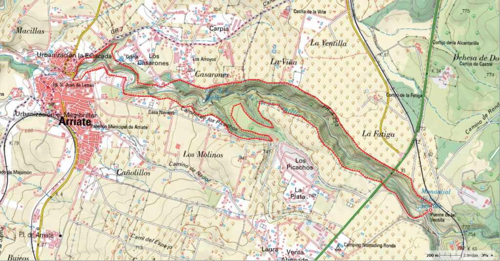 Tanto desde Arriate como desde el Puente de la Ventilla, los dos extremos de la Garganta, contabilizamos los siguientes caminos públicos municipales: